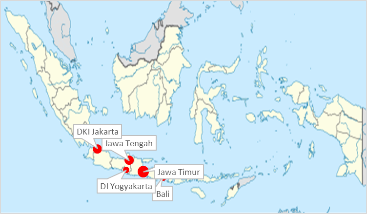 Tabel di atas menunjukkan banyaknya pengunjung di tahun 2022 dan disajikan dalam bentuk diagram peta seperti di bawah ini. Terdapat pada daerah DKI Jakarta, DI Yogyakarta, Jawa Timur, Jawa Tengah, dan Bali.